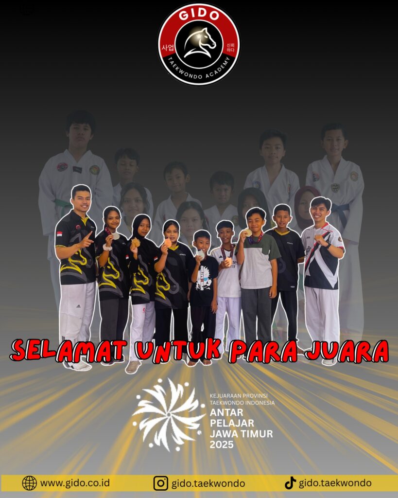 GIDO TAEKWONDO – Prestasi membanggakan datang dari atlet didikan dari GIDO Taekwondo Malang. Sepuluh medali dapat diraih oleh atlet dari kelas prestasi dan semi prestasi di Kejuaraan Provinsi Taekwondo Antar Pelajar Jawa Timur (Kejurprov Jatim) 2025.